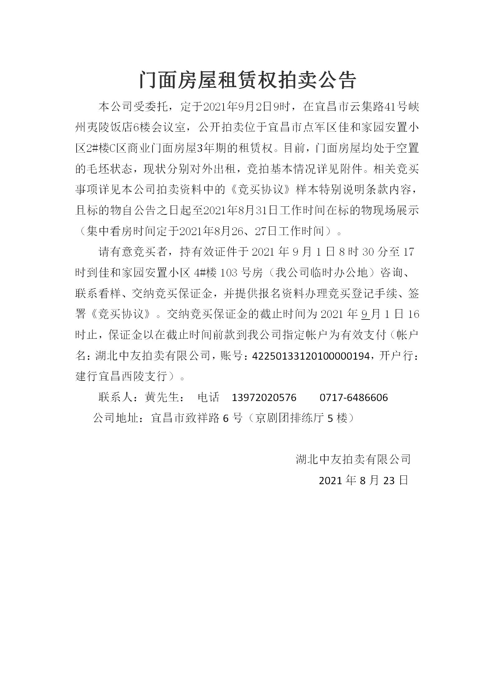 (通訊員周琴、彭曉燕)點軍區(qū)佳和家園安置小區(qū)2#樓C區(qū)商業(yè)門面房屋是點軍區(qū)國資局授權宜昌點盛投資開發(fā)有限公司經(jīng)營管理的安置房商業(yè)資產,目前該項目正在開展租賃權競拍工作,競拍公告已發(fā)布點軍區(qū)人民政府網(wǎng),現(xiàn)將公告內容公布如下: