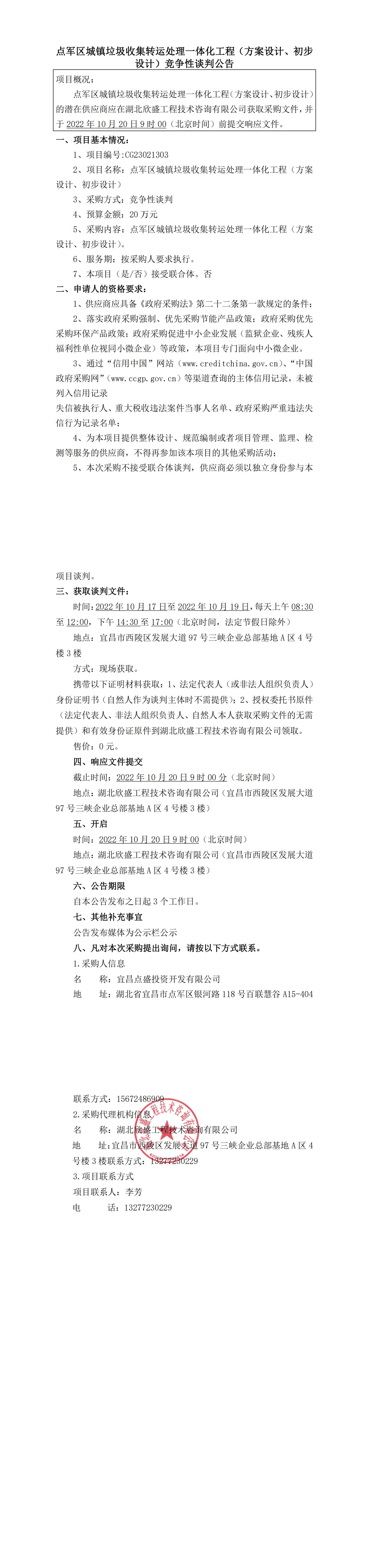 點(diǎn)軍區(qū)城鎮(zhèn)垃圾收集轉(zhuǎn)運(yùn)處理一體化工程(方案設(shè)計(jì)、初步設(shè)計(jì))競爭性談判公告