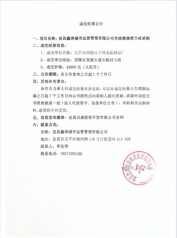 宜昌鑫澤城市運(yùn)營管理有限公司市政維修荷蘭磚采購項目成交公告