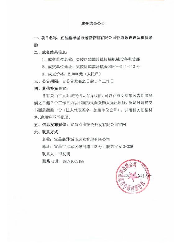 宜昌鑫澤城市運營管理有限公司管道敷設設備租賃采購項目