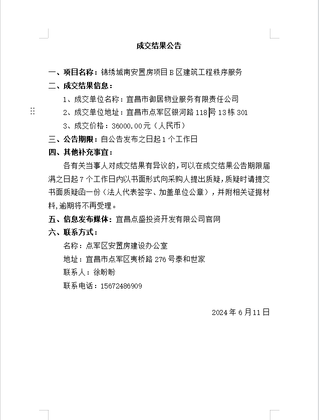 錦繡城南安置房項目B區(qū)建筑工程秩序服務(wù)成交公告