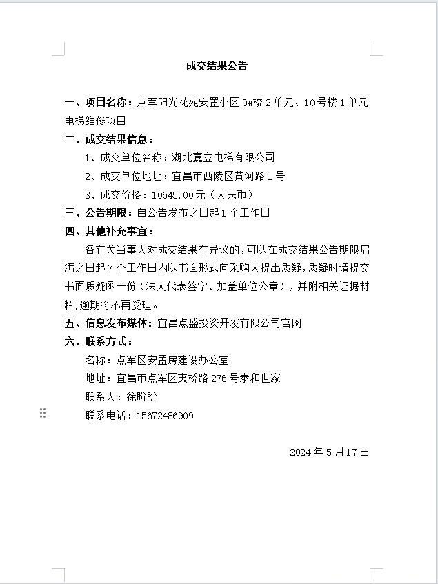 點軍陽光花苑安置小區(qū)9#樓2單元、10號樓1單元電梯維修項目成交公告