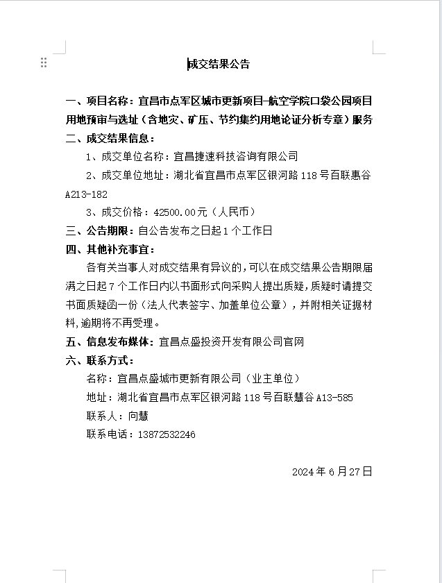 宜昌市點(diǎn)軍區(qū)城市更新項(xiàng)目-航空學(xué)院口袋公園項(xiàng)目用地預(yù)審與選址(含地災(zāi)、礦壓、節(jié)約集約用地論證分析專(zhuān)章)服務(wù) 成交公告