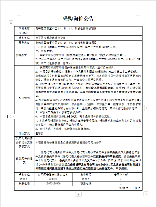 奧錦花園安置小區(qū)1#、3#、4#、8#樓電梯維修項目詢價公告
