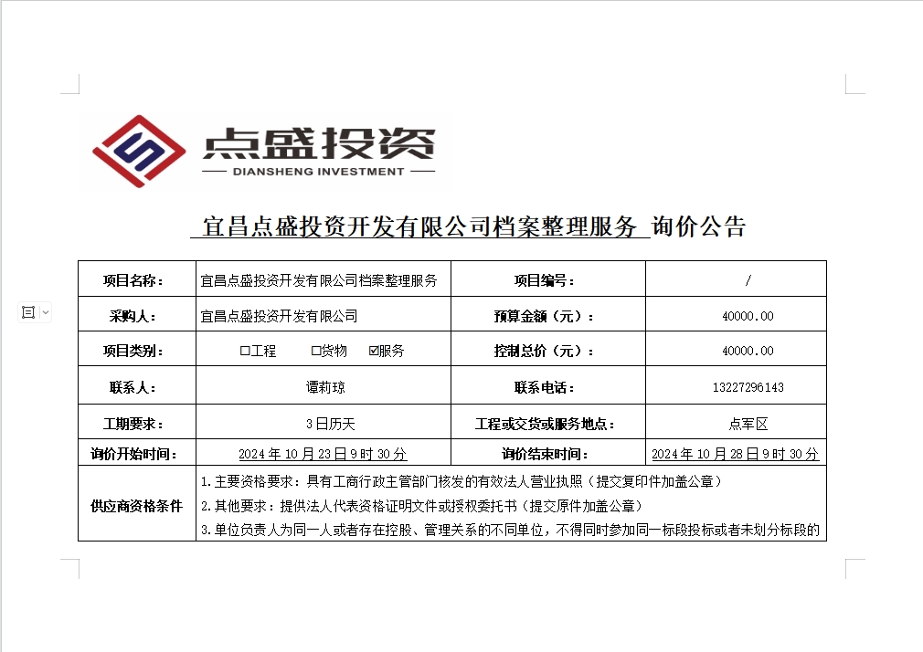 宜昌點盛投資開發(fā)有限公司檔案整理服務(wù)詢價公告