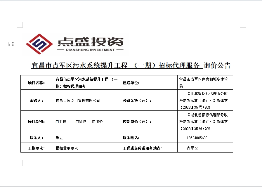 宜昌市點(diǎn)軍區(qū)污水系統(tǒng)提升工程 (一期)招標(biāo)代理服務(wù)詢價公告
