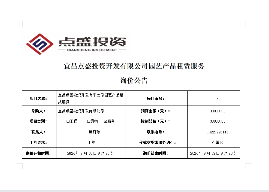 宜昌點盛投資開發(fā)有限公司園藝產品租賃服務詢價公告