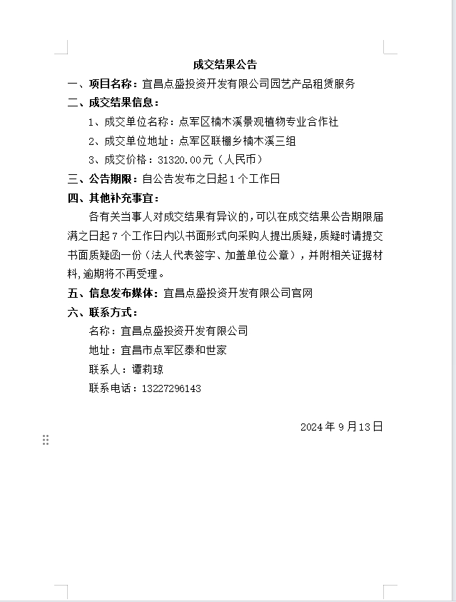 宜昌點盛投資開發(fā)有限公司園藝產(chǎn)品租賃服務(wù)成交公告