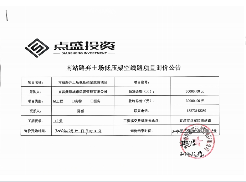 南站路棄土場低壓架空線路項(xiàng)目詢價公告